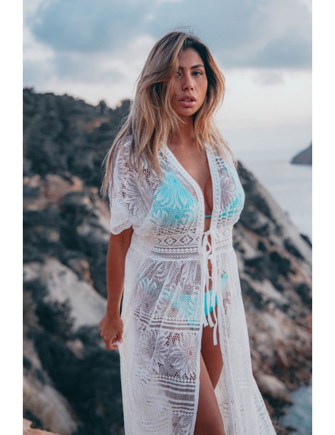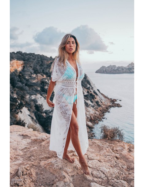REF.227045.vestido blanco tipo caftán calado, doble cierre en cintura con cordón de gasa.